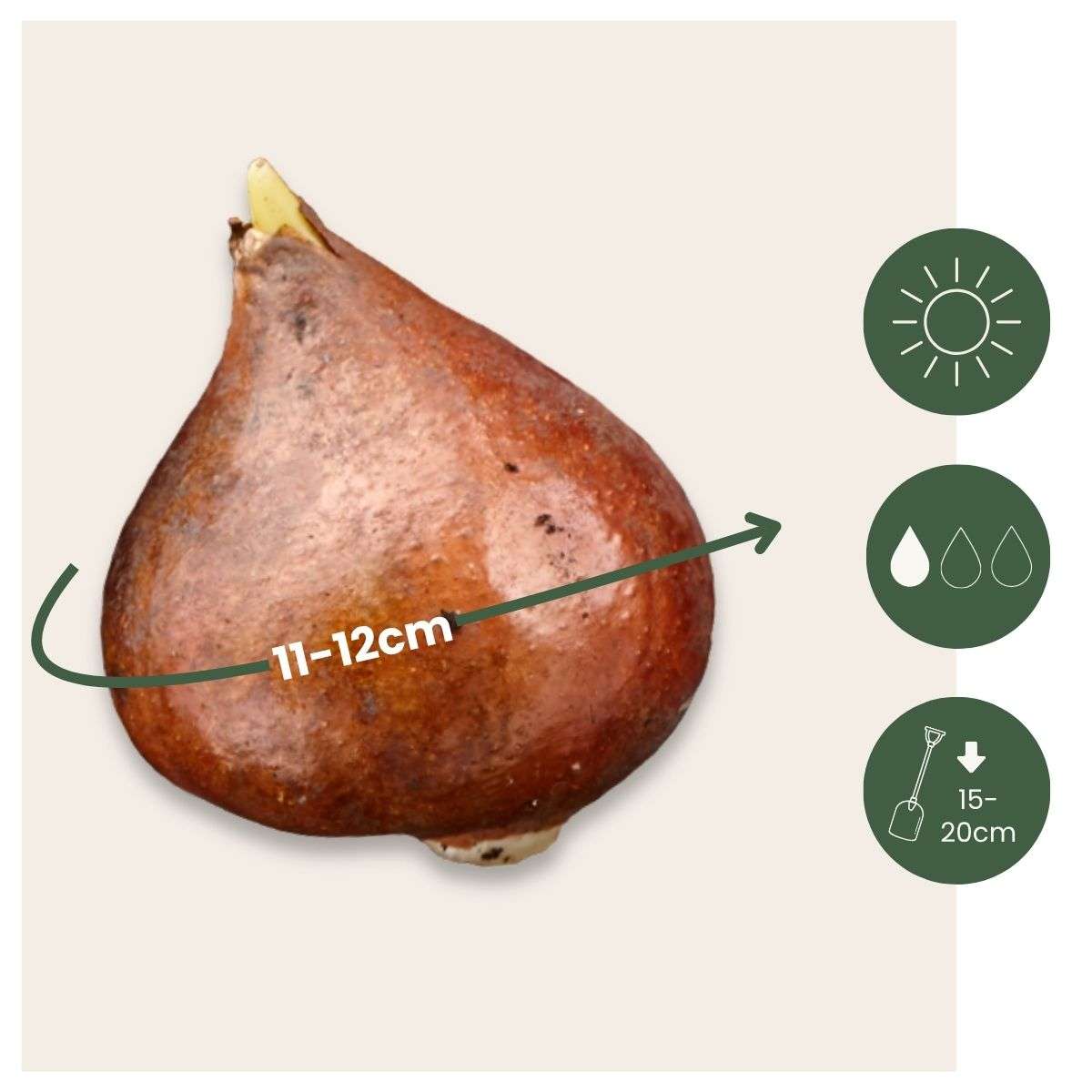 Gėlių svogūnėlių apimtis po pristatymo yra apie 12 cm.